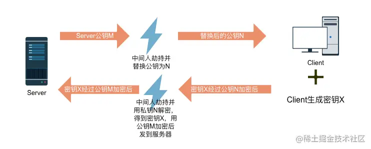 中间人有一套公钥N&私钥N,他劫持了服务器发到客户端的公钥M,替换成自己的公钥N,客户端拿到公钥N来加密密钥X,回传到服务器过程中又被中间人劫持并解密,中间人就这样拿到了密钥X,后续双方的数据传输对中间人来说,等于是明文传输。下面就来解决这个问题: