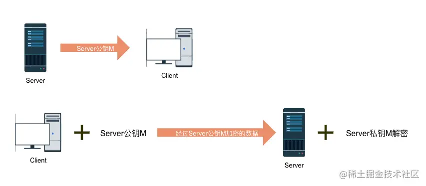 - 客户端对服务器发起请求,服务器返回公钥M给客户端