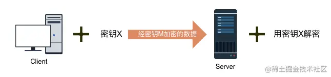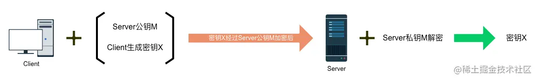 - 客户端随机生成密钥X,用服务器的公钥M加密密钥X并传给服务器