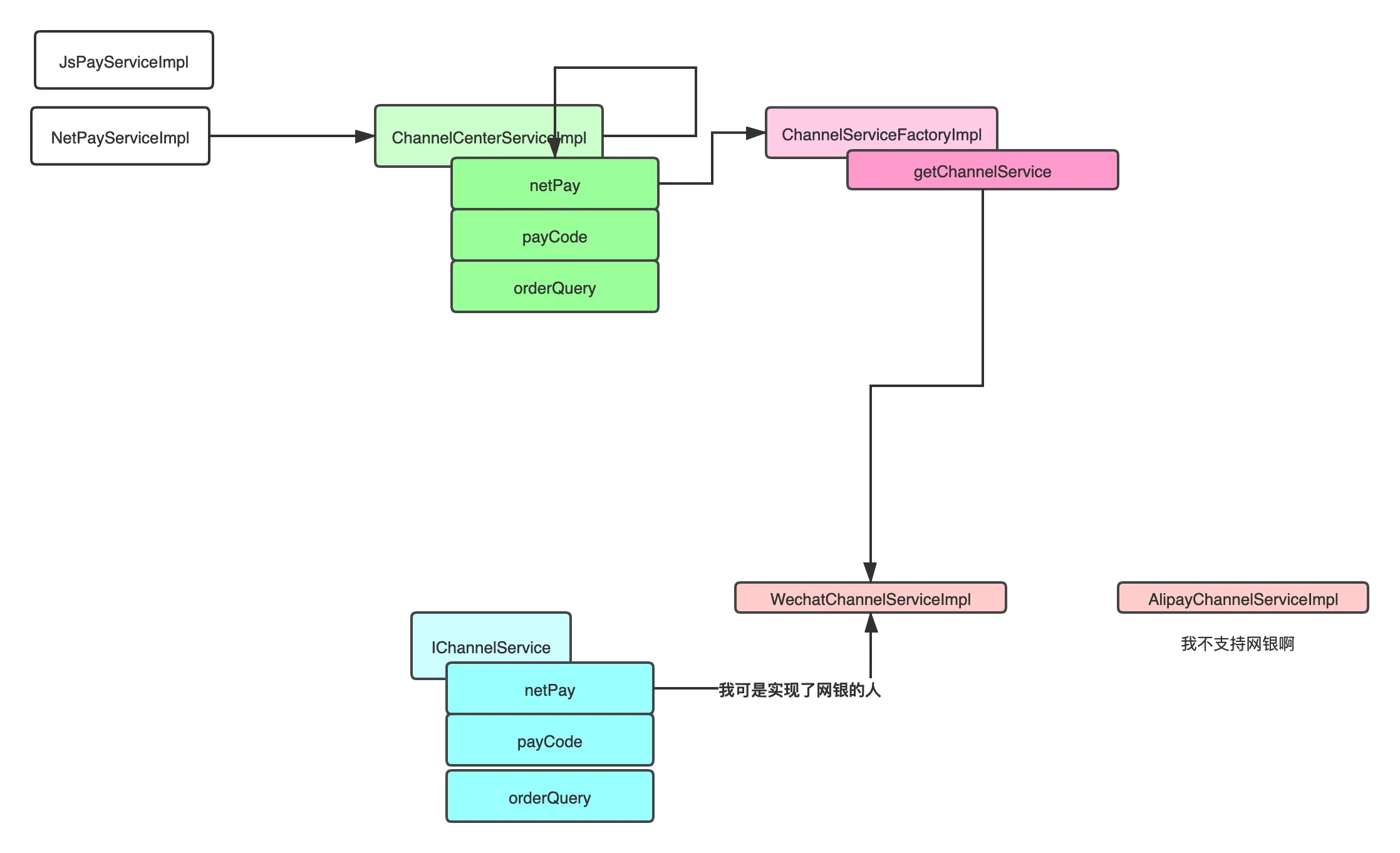 此时路过的大哥不小心瞟见了,看了半天后说道:“你这个设计很妙啊,将所有的通道接口都封装在一个类里面,这样不同的通道只需要实现这个接口就行了。通过传入通道编号再通过工厂方法来获得这个通道服务,然后调用指定的方法。问一下,这是工厂方法加策略模式吗?高,实在是高!” 。“必须的,我可是精通设计模式的辣个男人,吊不吊?” 小希淡淡的对大哥说道,但其实内心兴奋早已压制不住,终于逮住机会让我炫一波技了。“不过我还有个疑问,最前面的 NetPayServiceImpl 和 JsPayServiceImpl 是前面的入口这我可以理解,但是 ChannerlCenterServiceImpl 是做什么的?” 大哥谦虚的问道。“这个嘛,所有通道的统一入口,你可以在里面做很多事情,虽然我现在只是在里面打了下日志,但这是为以后扩展设计,懂我意思吧?”。听罢,大哥点了点头端着自己的枸杞茶默默的回到了自己的工位,果然我还是太菜啊,心里默念道。