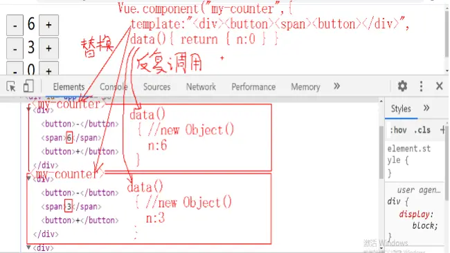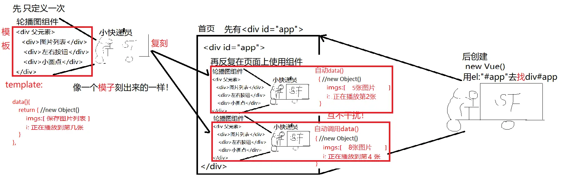 Vue.component("组件名",{ //其实每个组件都是一个功能完整的小快递员,麻雀虽小五脏俱全! //所以,一个组件的内容和new Vue()的内容几乎完全一样 el:"#app", template:`HTML片段`, //模板,强调: 组件的HTML片段必须包含在一个唯一父元素内 data:{ 变量 }, data(){ //可反复调用,每次调用都返回一个新的保存数据的对象——老母鸡下蛋 return { //new Object() 变量: 初始值: ... : ... } }, //其余完全一样! methods:{ 函数 }, computed:{ 计算属性 }, mounted(){ ... } ... ... })
