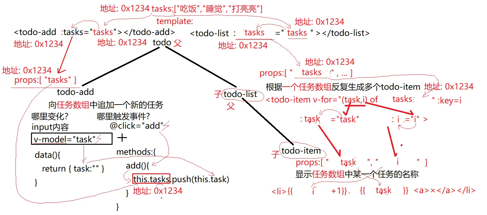 a. 根组件root: 一个页面只有一个,监控整个页面的组件 new Vue({ ... ... }) b. 全局组件: 可在任何位置反复使用的页面独立功能区域——没有限制Vue.component("组件名", { ... }) c. 子组件: 只能在某个指定的父组件内才能使用的小组件,2步: 1). 创建子组件对象: var 子组件名={ //和Vue.component中的格式完全一样! template:`HTML片段`, data(){ return { 变量 } }, ... ... } 强调: 因为子组件名是一个js变量,所以,不能用-分割多个单词,必须用驼峰命名 2). 在父组件中添加components属性来限制子组件只能在自己范围内使用 Vue.component("父组件",{ template:`HTML片段`, data(){ return { 变量 }}, ... ... components:{ 子组件对象名 , ... , ... } }) 强调: 但是,父组件中components会将驼峰命名的子组件名自动翻译为-分割多个单词,所以在父组件template中使用子组件标签时,依然要使用-分割 比如: components:{ todoAdd, todoList } 自动翻译 <todo-add> <todo-list>(7). 坑: 因为创建父组件时就需要子组件对象了,所以引入时,比如先引入子组件,再引入父组件!