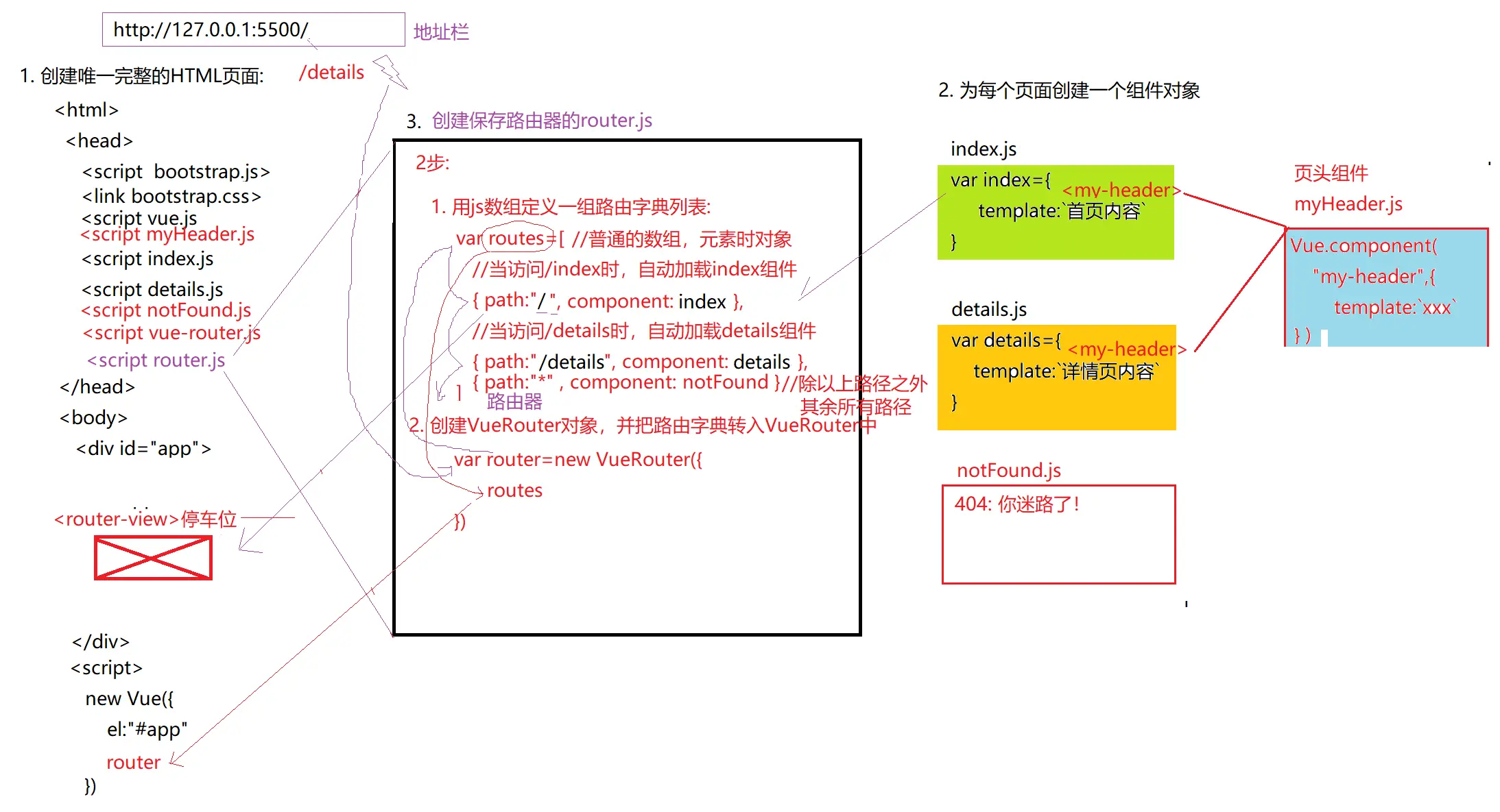 (3). 也会在专门的router.js文件中创建路由字典和路由器对象: 只不过: