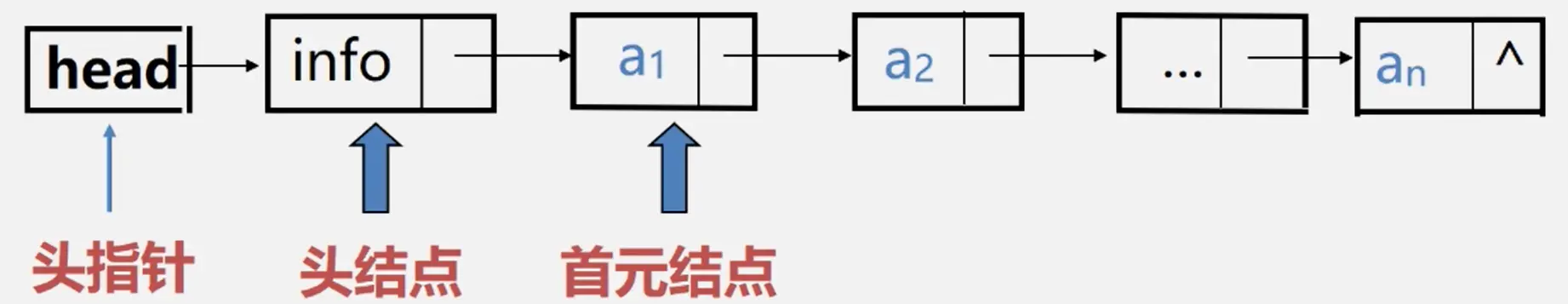 首元节点:指在链表中存储第一个实际数据元素的节点(比如上图的 a1 节点)