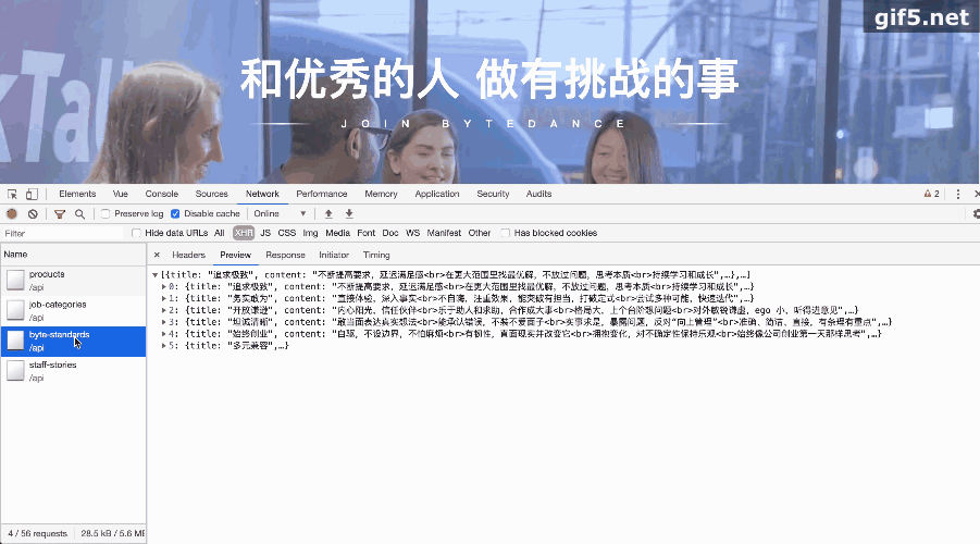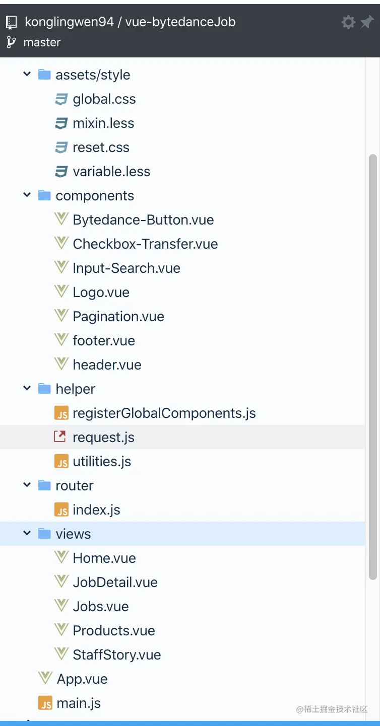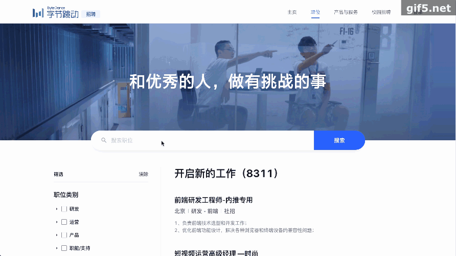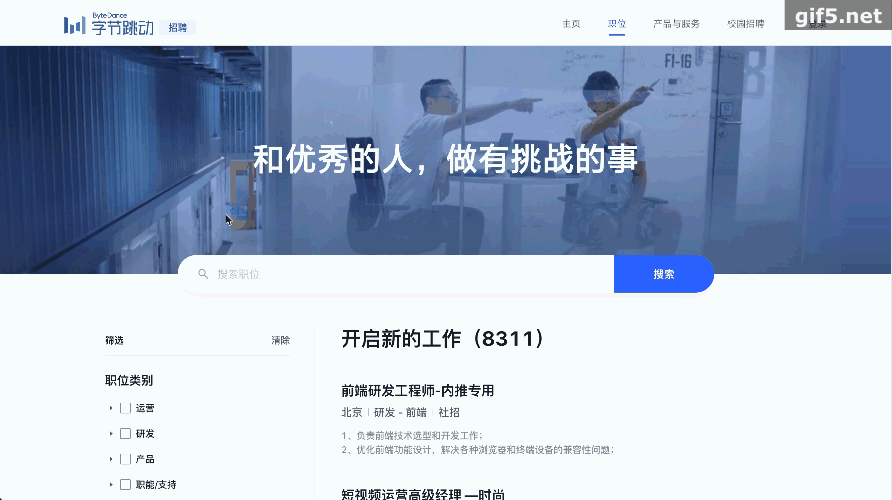 现如今社区上基于Vue的项目已经多如牛毛了,为了提升自己对vue的进一步理解,一直想找一个界面好看,功能完成的项目练练手。本人在逛各大招聘网站的时候发现了字节跳动的官方招聘网站很适合自己练手。当我发现这个网站是由react实现的,想了一下那我能不能用Vue的技术栈完整的重构出来呢?