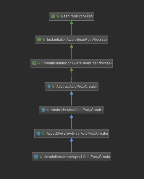 其中@EnableAspectJAutoProxy中的关键是@Import(AspectJAutoProxyRegistrar.class) @Import注解的作用是将参数class封装成BeanDefinition注册到spring中;但是AspectJAutoProxyRegistrar.class是一个注册器对象(ImportBeanDefinitionRegistrar接口对象),spring不会直接将注册器对象直接注册到spring中,而是在之后会执行ImportBeanDefinitionRegistrar接口对象的registerBeanDefinitions方法,将注册器中指定的对象注册到spring中。AspectJAutoProxyRegistrar.class的接口方法注册的是AnnotationAwareAspectJAutoProxyCreator.class对象,这个对象是一个BeanPostProcessor接口对象,也是AOP的功能实现核心对象。继承链如下图所示: