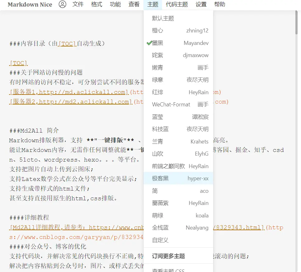 有时候我们在typora 中编写文章,觉得样式不满意,那么这款工具适合你,它支持不同主题样式的设定,相信适合你。