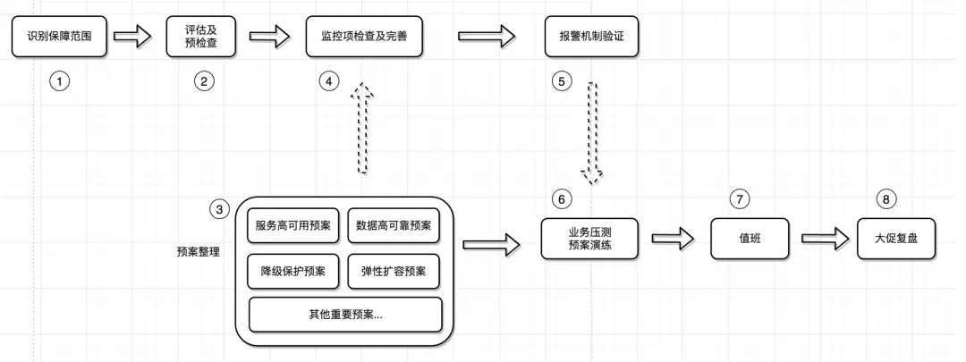 所谓识别保障范围就是为大促活动确定大的边界范围,整个集团的业务线成千上万条,哪些业务是这次大促核心链路上的业务,哪些是核心0级系统,哪些是核心1级系统?在大促备战开始之前需要明确边界范围,明确要保障的业务优先级,才能更方便后面大促保障工作的展开。