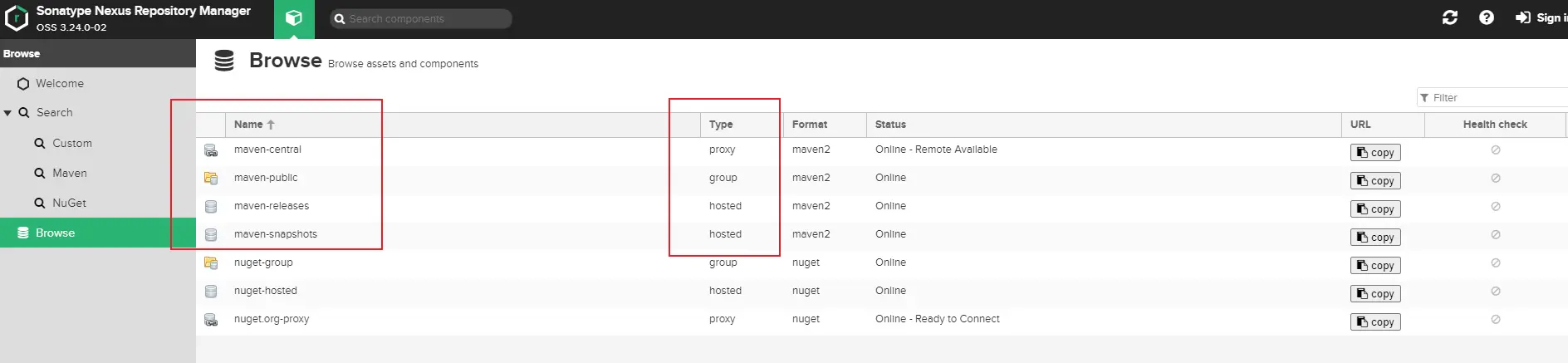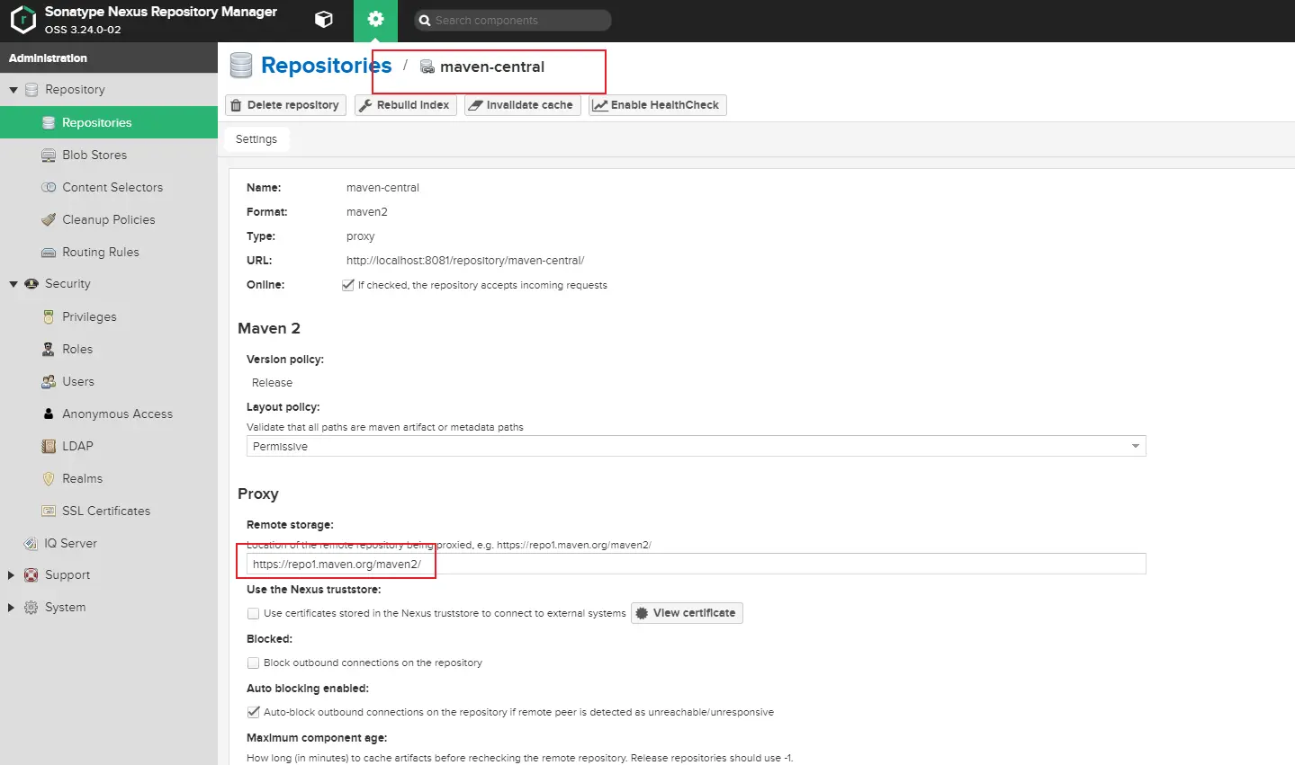 - proxy:代理类型,如图是用来代理中央仓库的,例如我们依赖的包在本地仓库没有,就会到私服获取,私服没有的话,会到中央仓库先把包下载到这里,然后再下载到本地仓库。