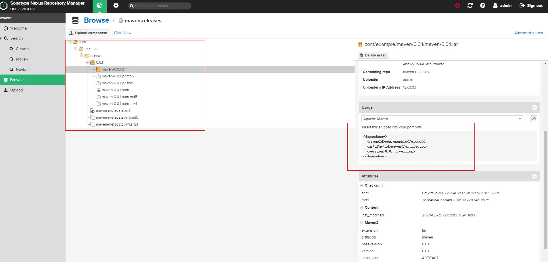 maven-releases仓库中已经有了我们推上去的包,其他项目可以通过坐标拉取到这个jar。