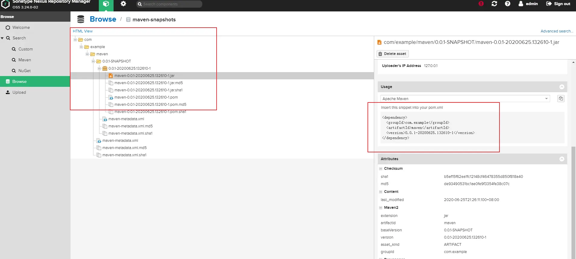 <version>0.0.1</version>改为<version>0.0.1-SNAPSHOT</version>快照版本,jar则会被推到maven-snapshots仓库中。