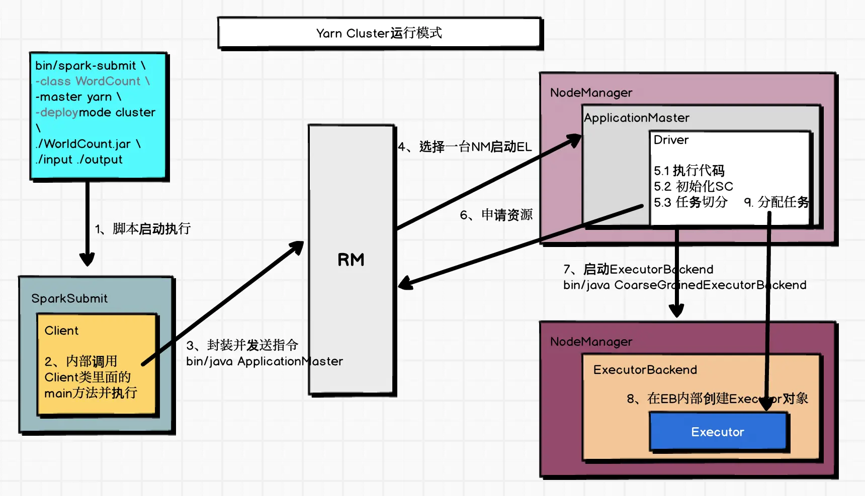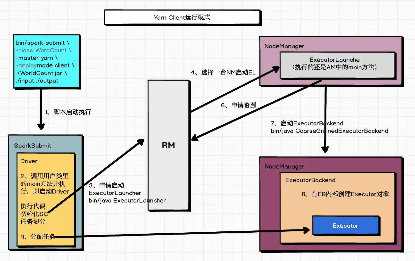 - Yarn:Spark客户端直连Yarn,不需要额外构建Spark集群。有yarn-client和yarn-cluster两种。区别:Driver运行节点。