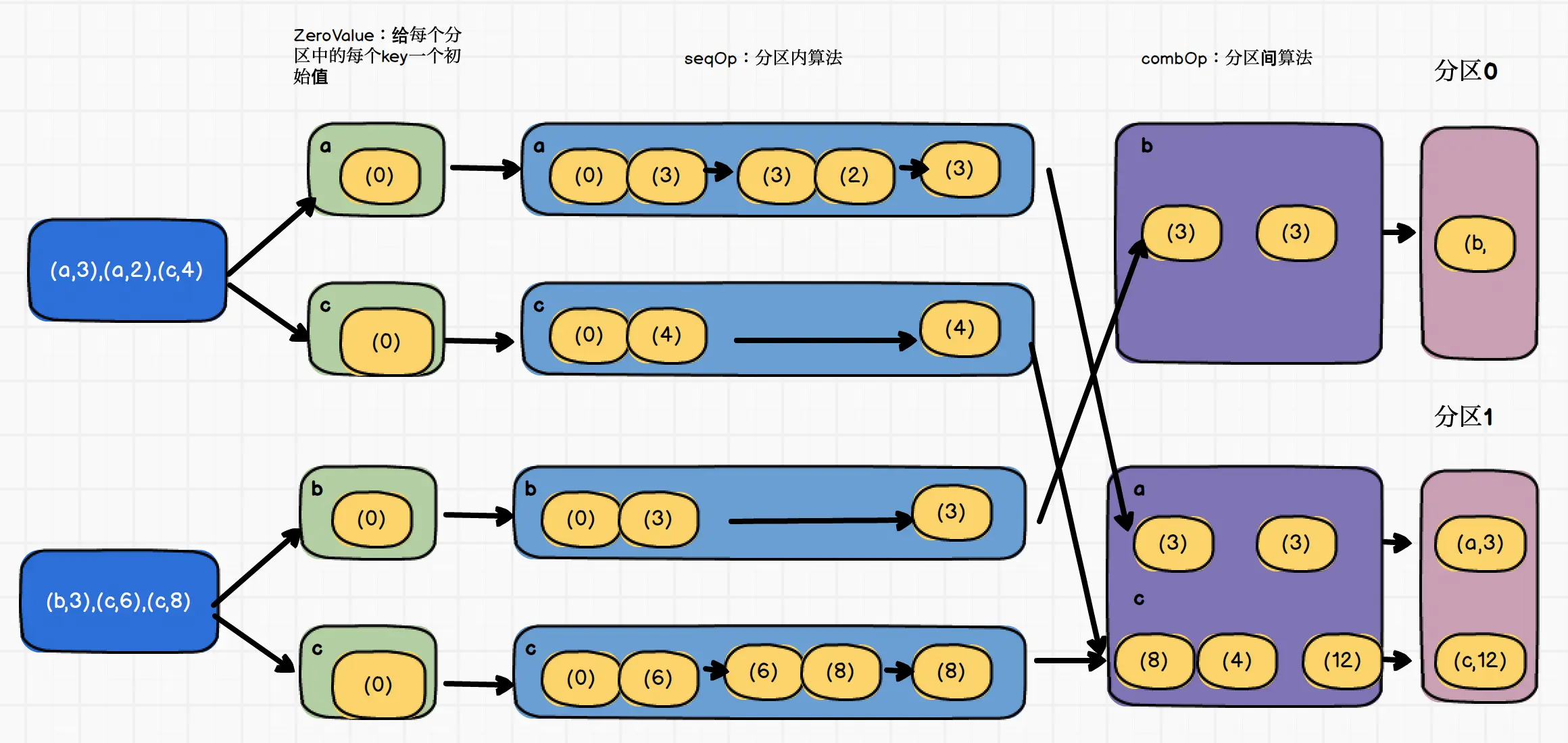 - aggregateByKey(zeroValue:U, [partitioner:Partitioner])(seqOp:(U, V)=>U, combOp:(U, U)=>U)