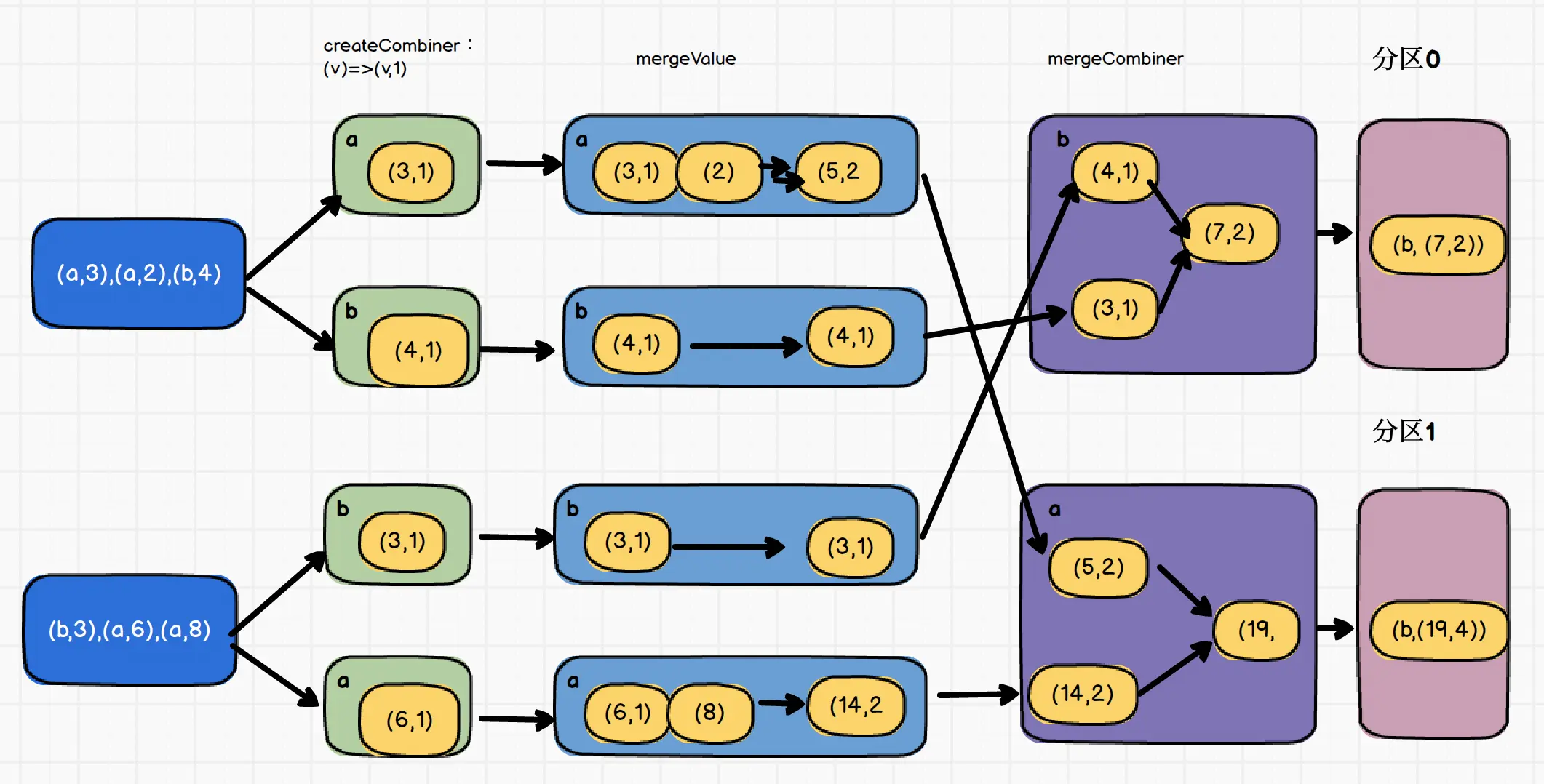 - combineByKey(createCombiner: V=>C, mergeValue:(C, V)=>C, mergeCombiners:(C, C)=>C)