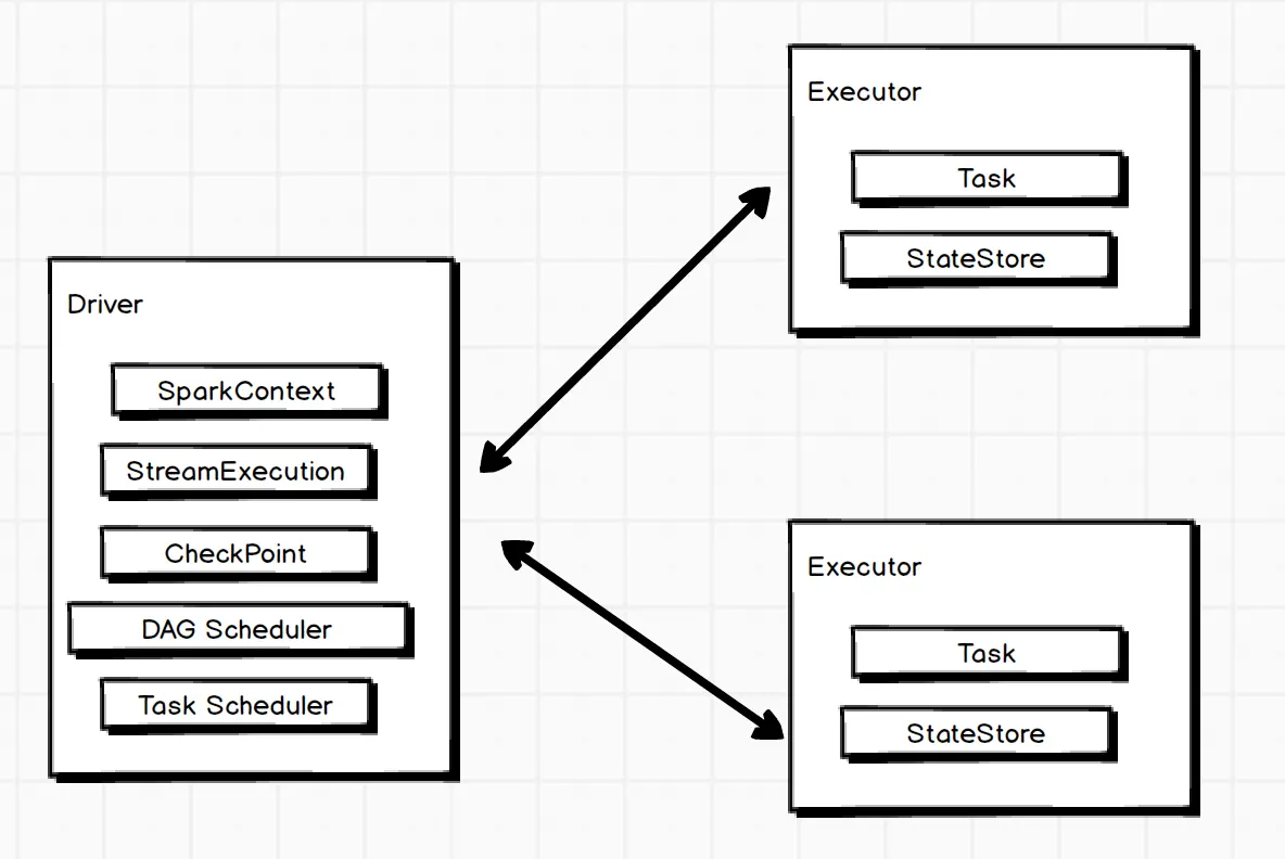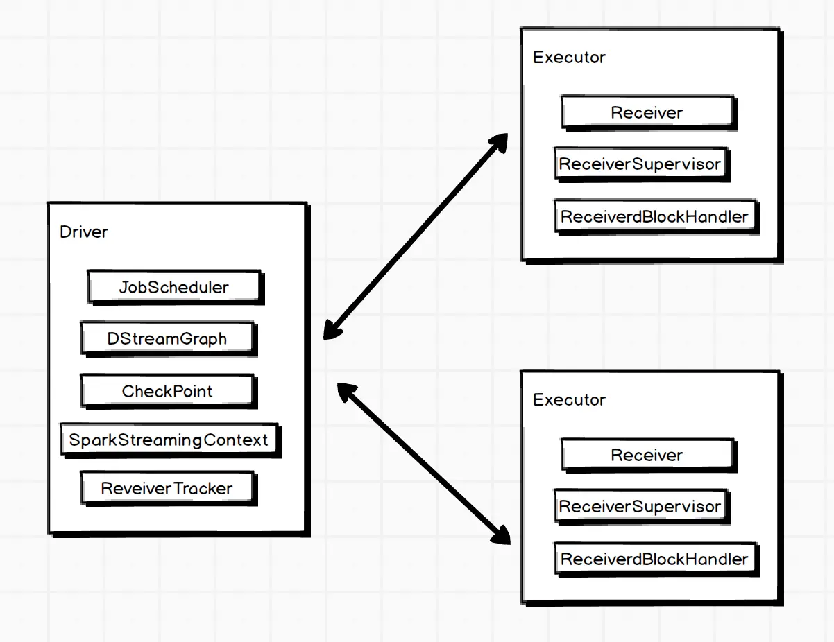 SparkStreamingContext:对作业进行一些配置,如:DStream切分的批次间隔(duration)、与其他模块如DStreamGraph和JobScheduler等交互DStreamGraph:维护了输入DStream和输出DStream的实例,还会通过generateJobs生成作业集合(RDD DAG),由JobScheduler调度启动执行任务JobScheduler:作业调度器,所有任务都是JobScheduler调度Executor完成的CheckPoint:Spark Streaming容错机制的核心,会定时对已算好的中间结果及其他中间状态进行存储,避免依赖链过长的问题Receiver Tracker:通过Executor上的ReceiverSupervisor来管理所有的receiver。主要功能是吧需要计算的数据发送给Executor,当Executor接收完毕后,将数据块的元数据上报给ReceiverTrackerExecutor:ReceiverTracker会和Executor通信,启动ReceiverSupervisor实例,ReceiverSupervisor启动Receiver接收数据。收到数据后,用ReceiverBlockHandler以块的形式写到Executor的磁盘或内存,对应的实现是BlockManagerBasedBlockHandler和WriteAheadLongBasedBlockManager。前者根据Executor的StorageLevel写到相应的存储层,后者先进行预写日志(Write Ahead Log).