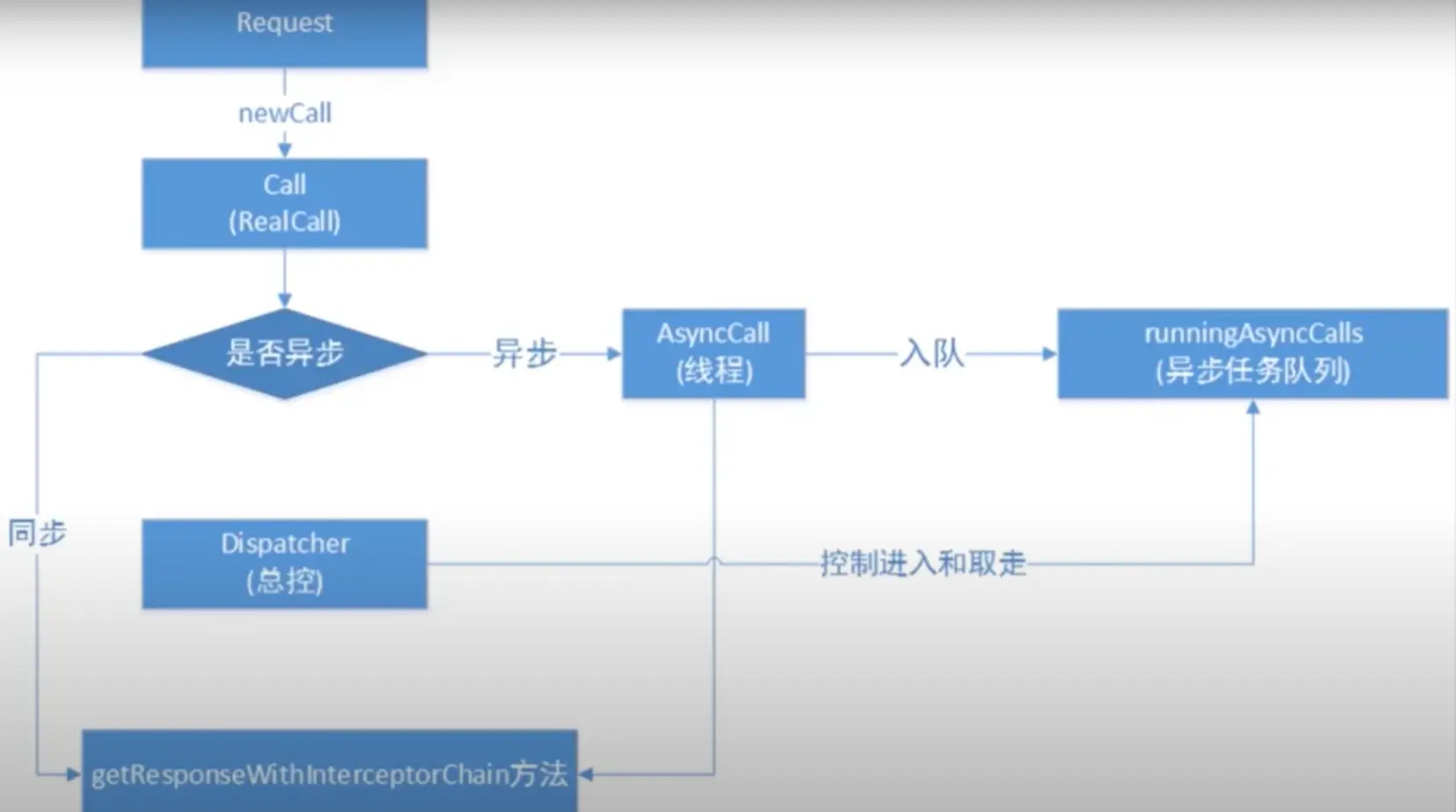 getResponseWithInterceptorChain方法:拦截器链,内部依次调用拦截器,详细见后。-- 进入Dispatcher的