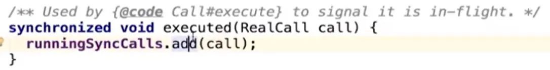 executed方法把请求(RealCall对象)添加到同步请求队列(runningSyncCalls)当中。