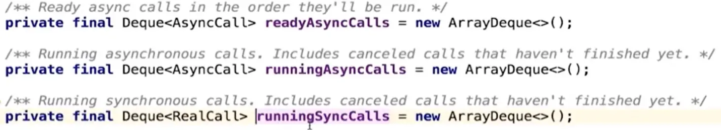 Dispatcher类中定义了3种队列(异步就绪/缓存等待请求队列readyAsyncCalls, 异步执行队列runningAsyncCalls, 同步请求队列runningSyncCalls)。--进入