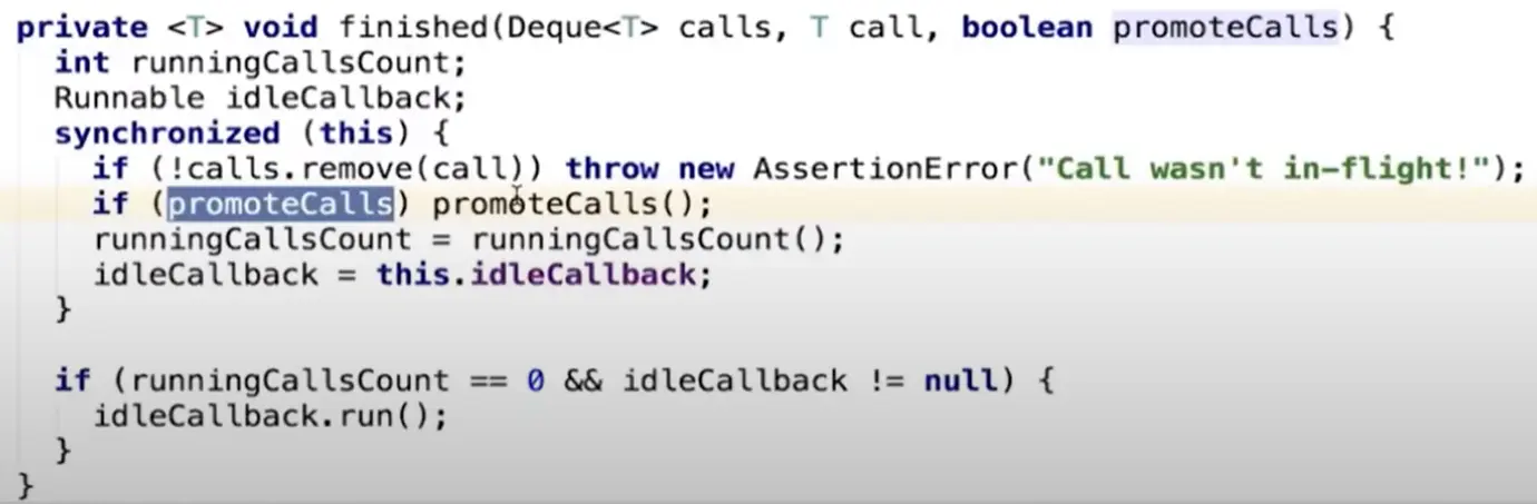 readyAsyncCalls)中,当异步执行队列runningAsyncCalls有空闲位置时,则从readyAsyncCalls中取出优先级高的请求放到runningAsyncCalls请求队列中执行。