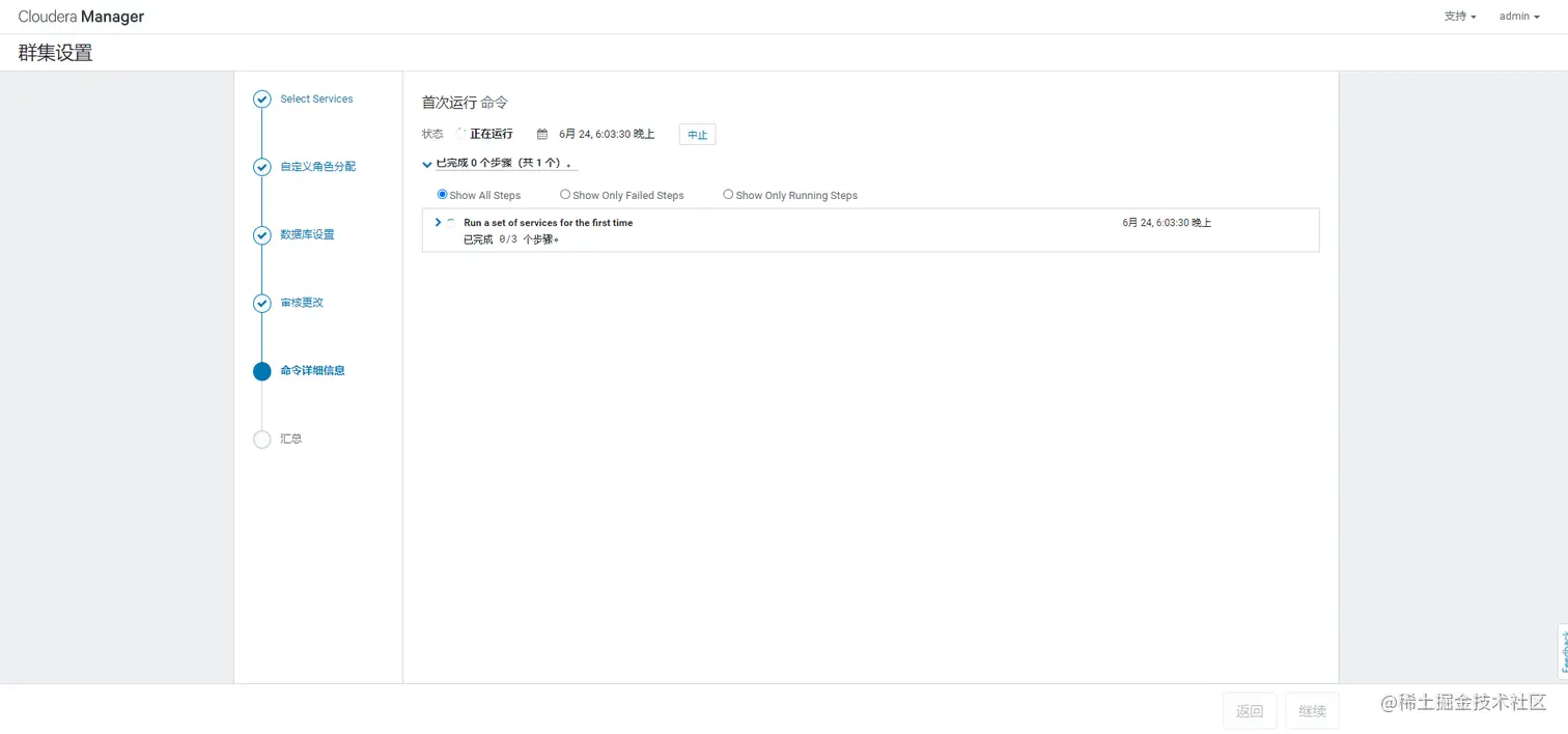 第一次开启HUE会出现以下页面,此时输入的用户名和密码可以随意,之后登录页面以第一次输入的账号密码为依据。例如,用户名:admin 密码:admin。