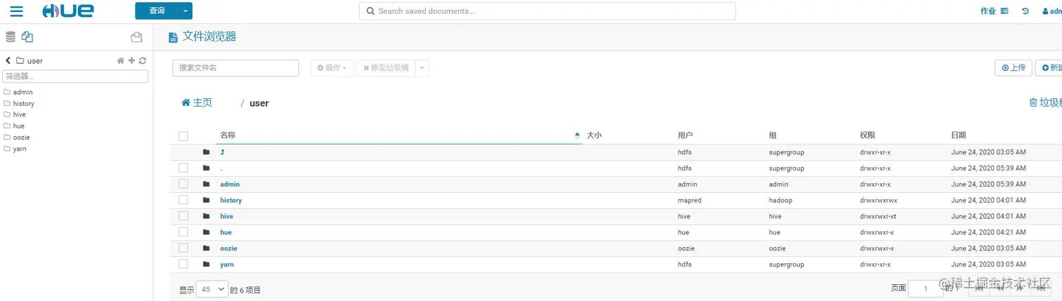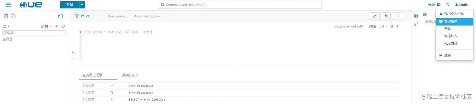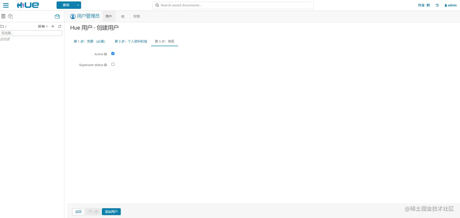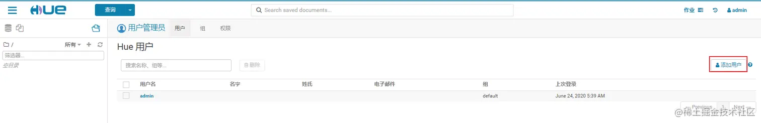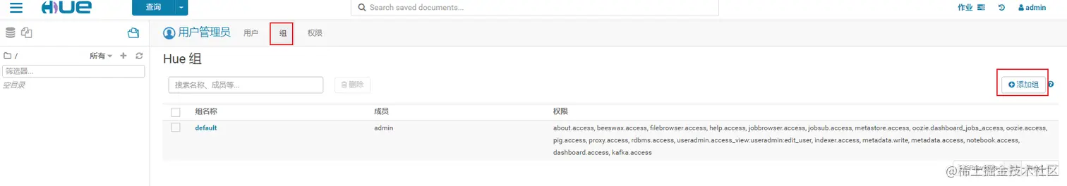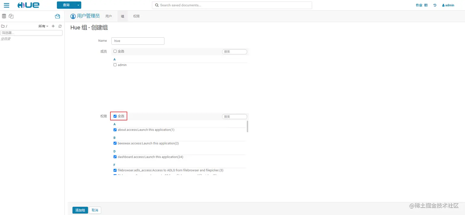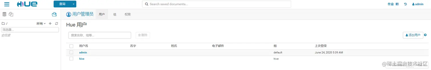 HUE的初始管理用户为admin,密码为admin。在HUE中新建一个用户组——hive,并在该组下新建一个用户——hive。