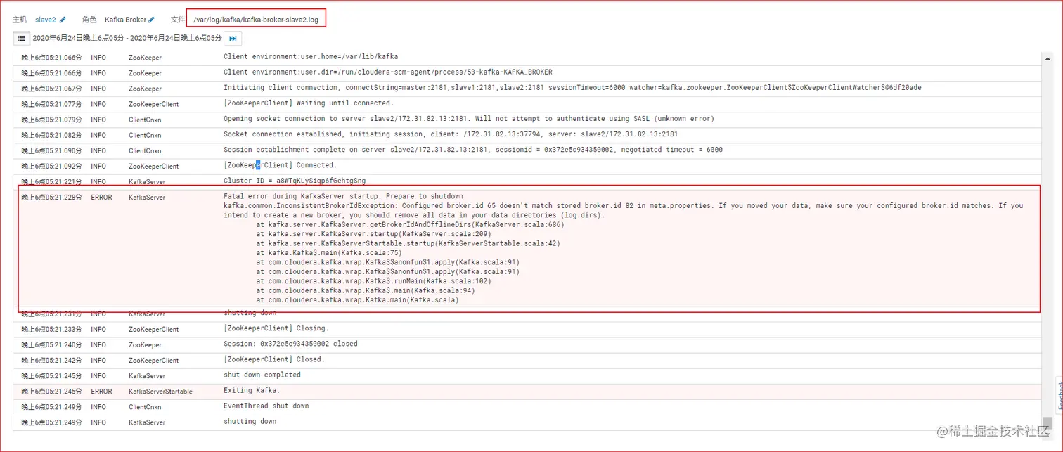 2020-06-24 18:05:36,246 ERROR kafka.server.KafkaServer: Fatal error during KafkaServer startup. Prepare to shutdown