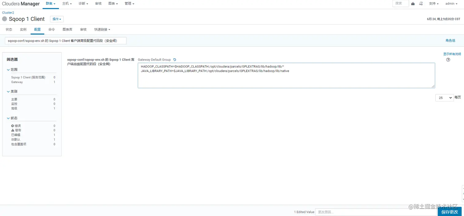 在Sqoop的配置项中搜索“sqoop-conf/sqoop-env.sh 的 Sqoop 1 Client 客户端高级配置代码段(安全阀)”,加入以下字段
