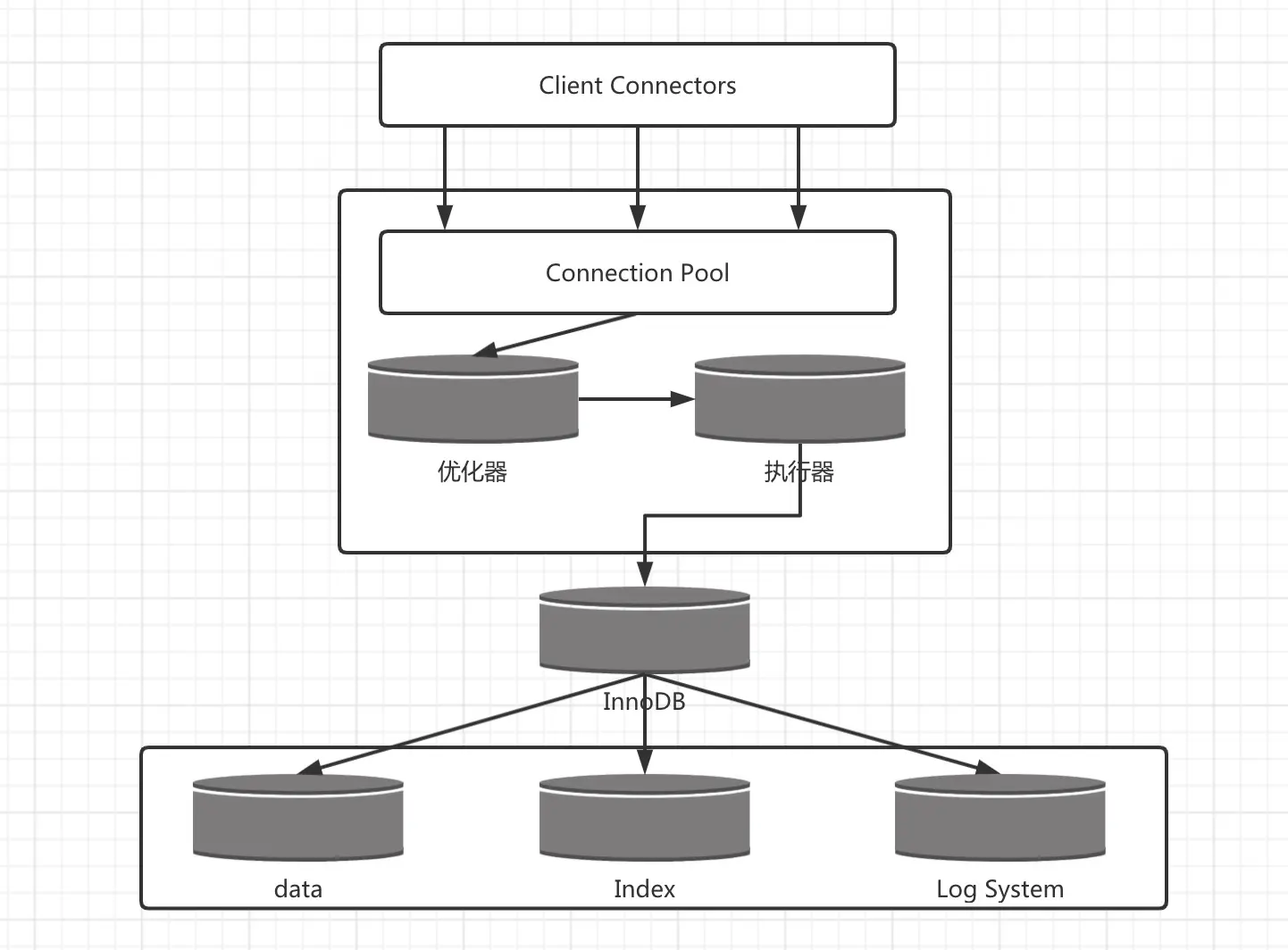 - 具体的数据、索引以文件形式存储在磁盘中;执行过程会生成日志文件,并依靠日志系统实现事务执行等其他功能。