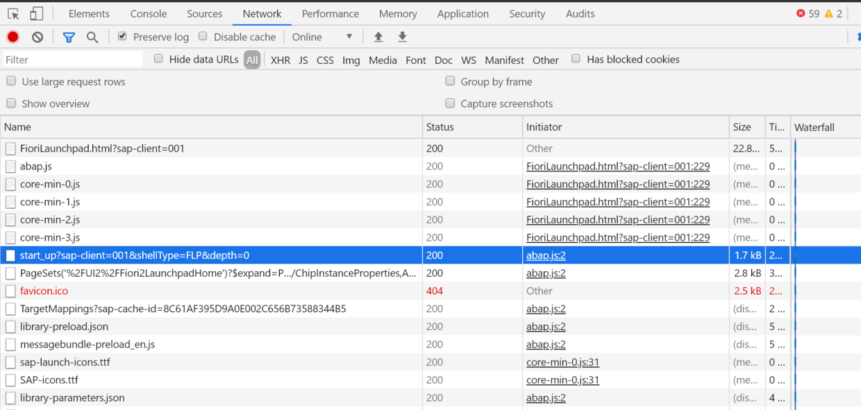 第一个请求是读取Fiori Launchpad的html实现源代码; 第二个请求abap.js是前台UI5连接以ABAP为技术栈的SAP后台系统所需的ABAP Unified Shell的引导库文件; 第三到第六个请求core-min-<数字>.js用来加载UI5库文件;