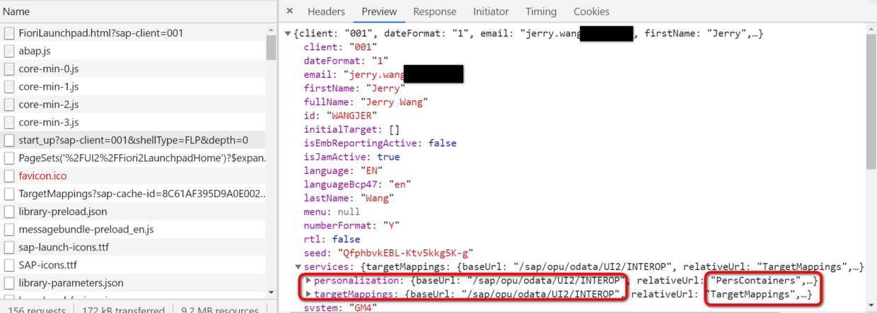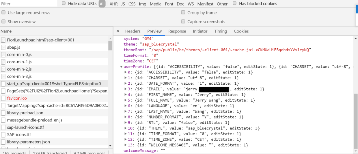既然当前我使用的用户Jerry Wang登录系统之后能看到这些tile,那么用Chrome开发者工具观察该用户登录之后,从浏览器向Gateway系统发起的请求和收到的响应即可找到线索。