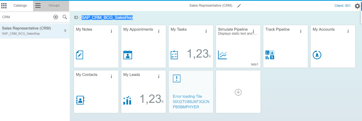 实际上找到这个ID就足够了。在Gateway系统上执行事务码/UI2/FLPD_CUST,打开Fiori Launchpad Designer,根据ID SAP_CRM_BCG_SalesRep找到这个Group,发现里面包含的tile正是Jerry Wang这个用户登录系统后看到的tile.