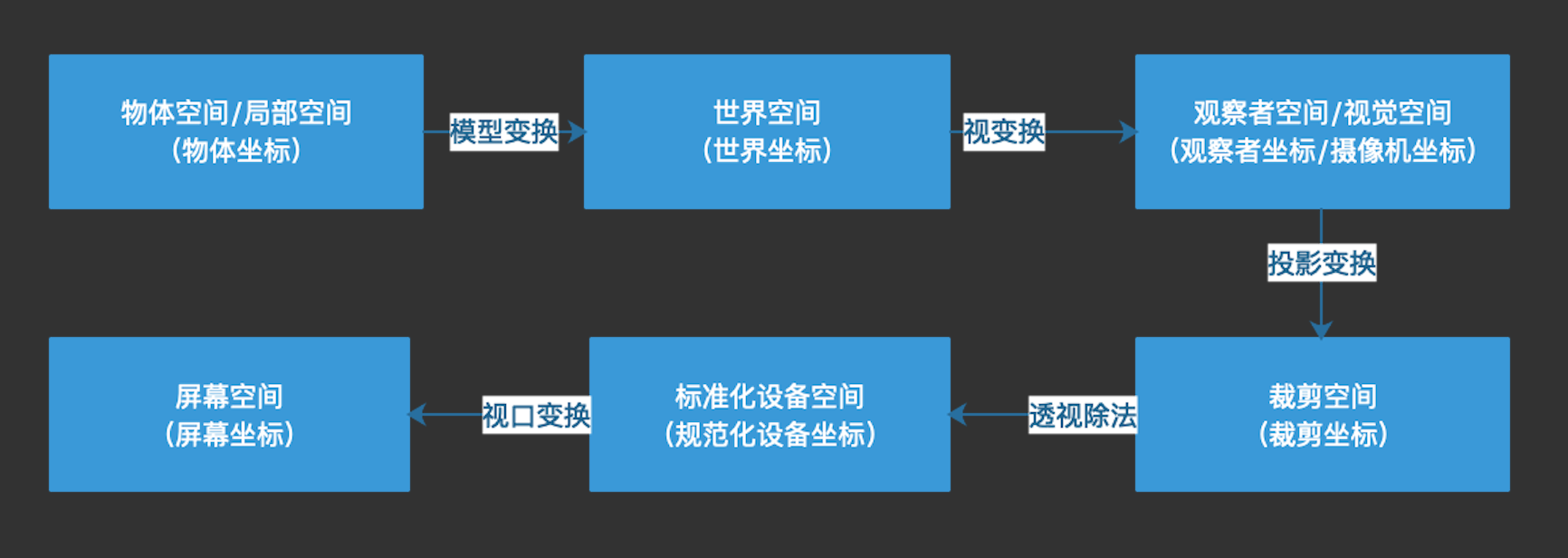 OpenGL只定义了裁剪坐标系、规范化设备坐标系和屏幕坐标系,而局部坐标系(模型坐标系)、世界坐标系和照相机坐标系都是为了方便用户设计而自定义的坐标系,关系如下图: