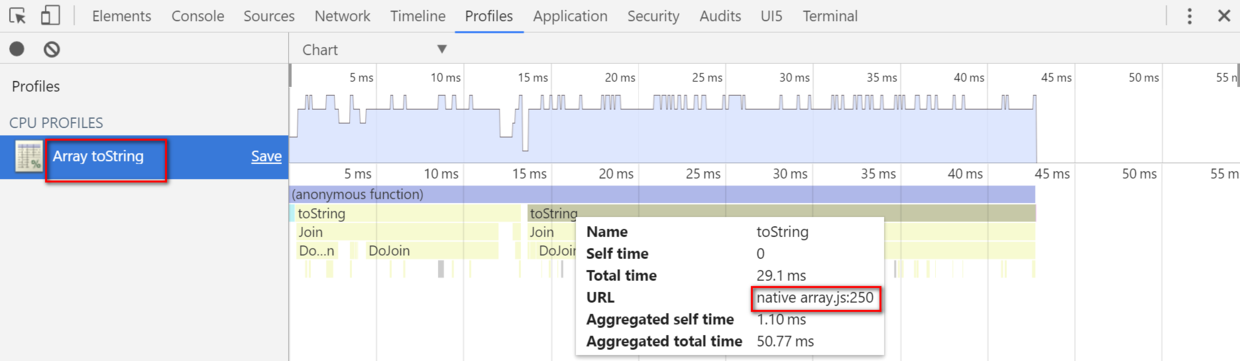 Once done, you can see a profile record with the name specified in JavaScript code above, “Array toString”. Hover the mouse to the first row, “anonymous function”, we find the hint “array.js”.