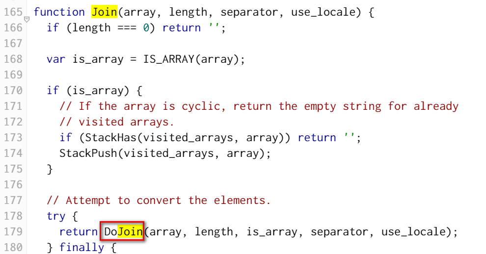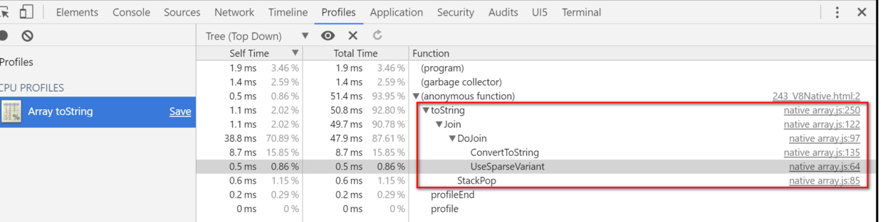 The callstack analyzed through the source code exactly matches the one we get in Chrome development tool Profile tab: ArrayToString will delegate to Join if current caller is an Array: