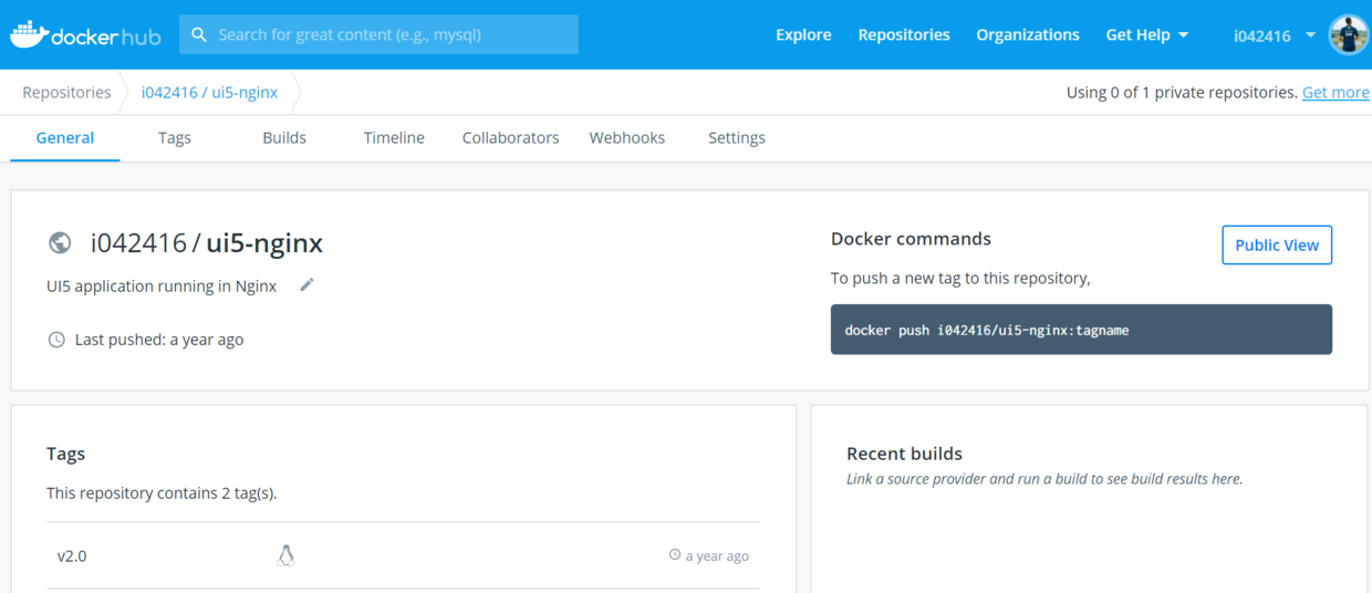Jerry已经事先开发好了一个SAP UI5应用,将其部署并运行在Nginx服务器上,并且把该应用和Nginx服务器一起打包在一个容器镜像内,并发布到Docker Hub上了,地址如下: