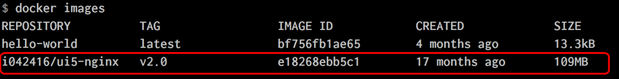 从命令打印日志能看出,因为我的本地环境没有这个名为i042416/ui5-nginx,标签为v2.0的镜像,因此首先会自动从Docker Hub将镜像下载到本地。