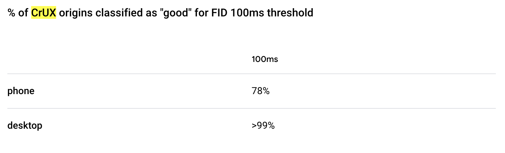 在评估候选核心Web Vitals“good”阈值时,我们根据Chrome用户体验报告(CRUX)中的数据验证了这些阈值是否可以实现。 为了确认可以达到阈值,我们要求目前至少有10%的来源满足“good”阈值。 此外,为确保优化的站点不会由于现场数据的可变性而被错误分类,我们还验证了优化的内容始终符合“good”阈值。