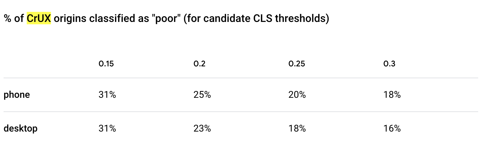 此外,为了确定CLS的“poor”阈值,我们使用CrUX数据来确定大多数来源满足的阈值: