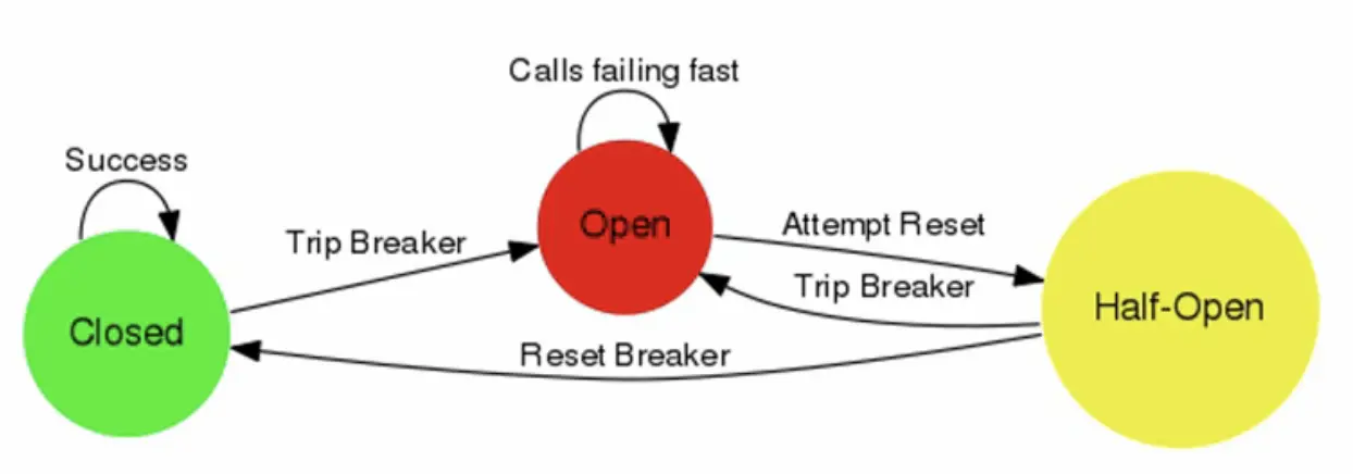 - 半开状态会放一部分流量进行尝试,如果请求成功,则恢复断路器为关闭状态,服务恢复正常;否则重置断路器状态为开通状态。