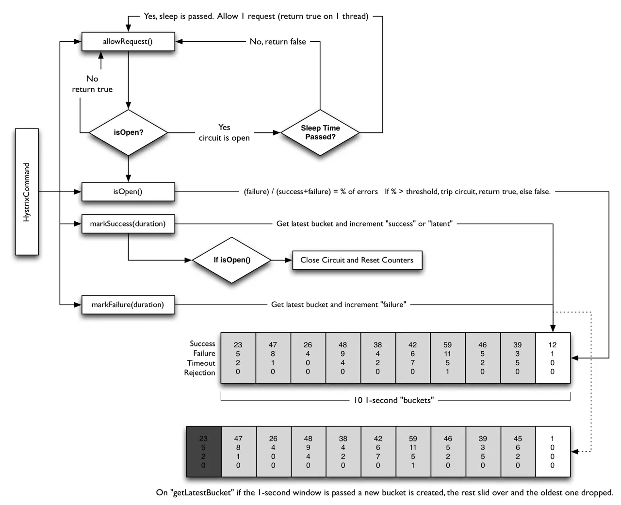 - 首先通过断路器的流量达到配置的阈值,流量太小不会触发断路器