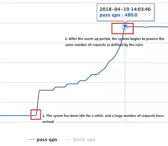 - 慢启动预热模式:当流量激增的时候,控制流量通过的速率,让通过的流量缓慢增加,在一定时间内逐渐增加到阈值上限,给冷系统一个预热的时间,避免冷系统被压垮。