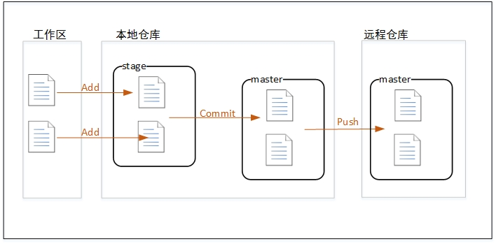 下图是Git与提交有关的三个命令对应的操作,Add命令是把文件从IDE的工作目录添加到本地仓库的stage区,Commit命令把stage区的暂存文件提交到当前分支的仓库,并清空stage区。Push命令把本地仓库的提交同步到远程仓库。