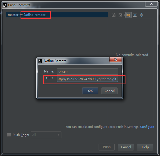 因为是第一次提交,Push前需要指定远程仓库的地址。如下图,点击Define remote后,在弹出的窗口中输入远程仓库地址。