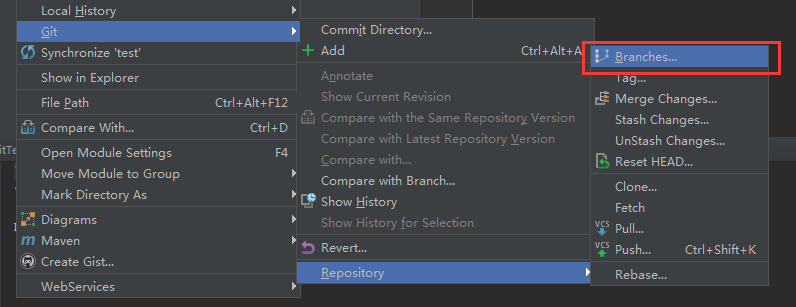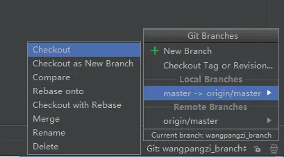 点击后弹出一个小窗口,在Local Branches中有其他可用的本地分支选项,点击后选择Checkout即可切换当前工作的分支。