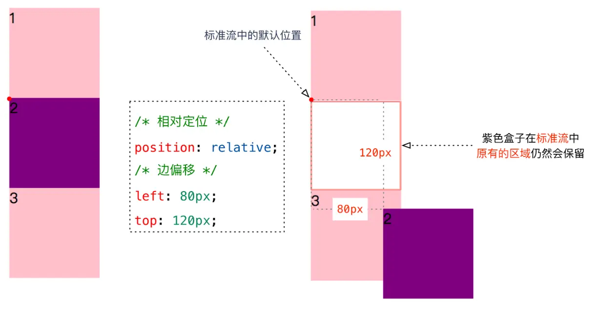相对定位是元素相对于他自己原来在标准流中的位置来移动的。