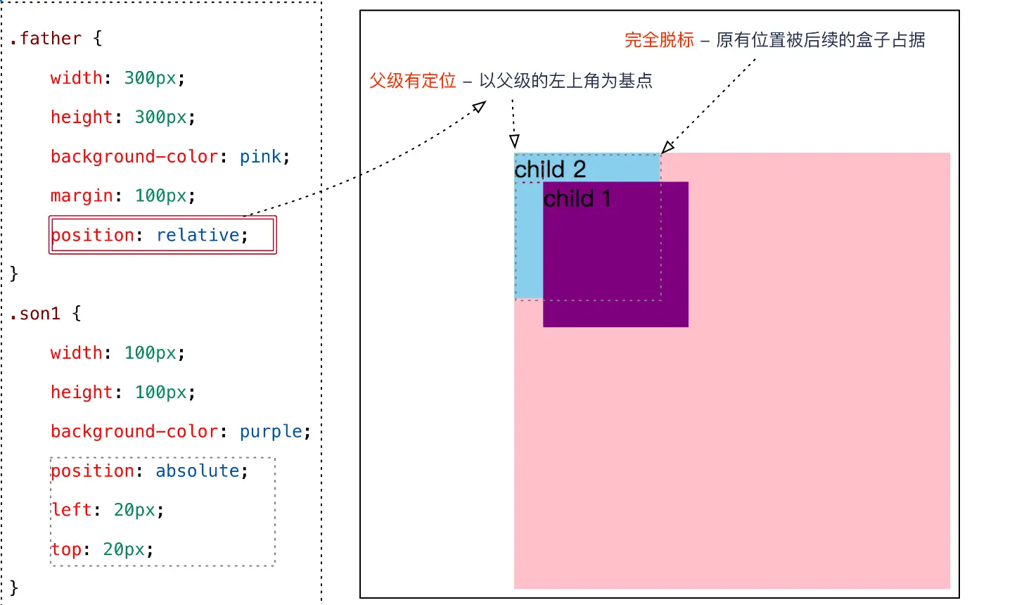如👇图所示的,父级元素有一个相对定位模式,给子元素设置一个绝对定位,此时子盒子会以父级的左上角为标准点进行定位。