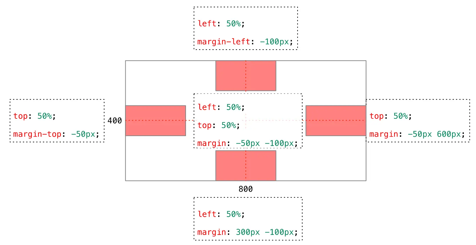 我们先看这个图片,整个黑色边框是一个长800px,高度为400px的大盒子,示例盒子宽度为200px,高度为100px,上下两个盒子分别水平居中,左右两个盒子是垂直居中,和水平居中原理一致。