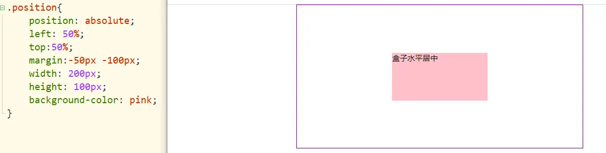 重点来啦,我们平时经常会用到的垂直水平居中,给盒子设置绝对定位后,设置:left:50%,top:50%,这时会发现盒子距离中间位置向右多偏移了宽度的一半,向下多偏移了高度的一半,所以也是需要减去的,给盒子来一个margin:-50px -100px;具体代码示例如下👇: