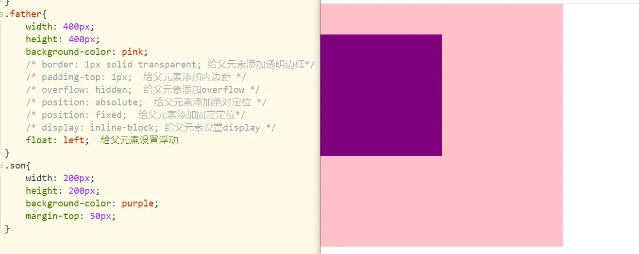 之前我们有提到过,当给一个父元素内部的子元素设置margin值的时候,父级元素可能也会发生改变,即外边距合并就是通常所说的塌陷,但是绝对定位和浮动不会触发外边距合并👇: