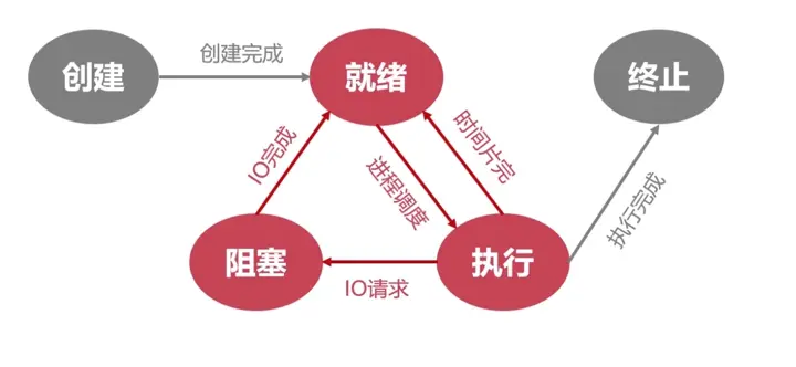 当执行状态的进程发生IO请求的时候就有可能变成阻塞状态(前边有说到请求打印机的例子)。当发生IO完成的时候,就会由阻塞状态切换到就绪状态